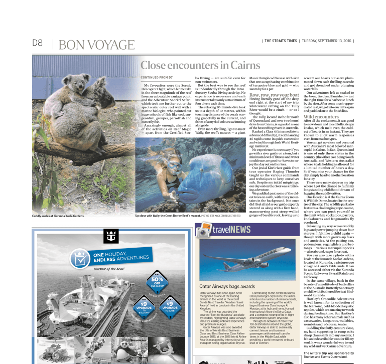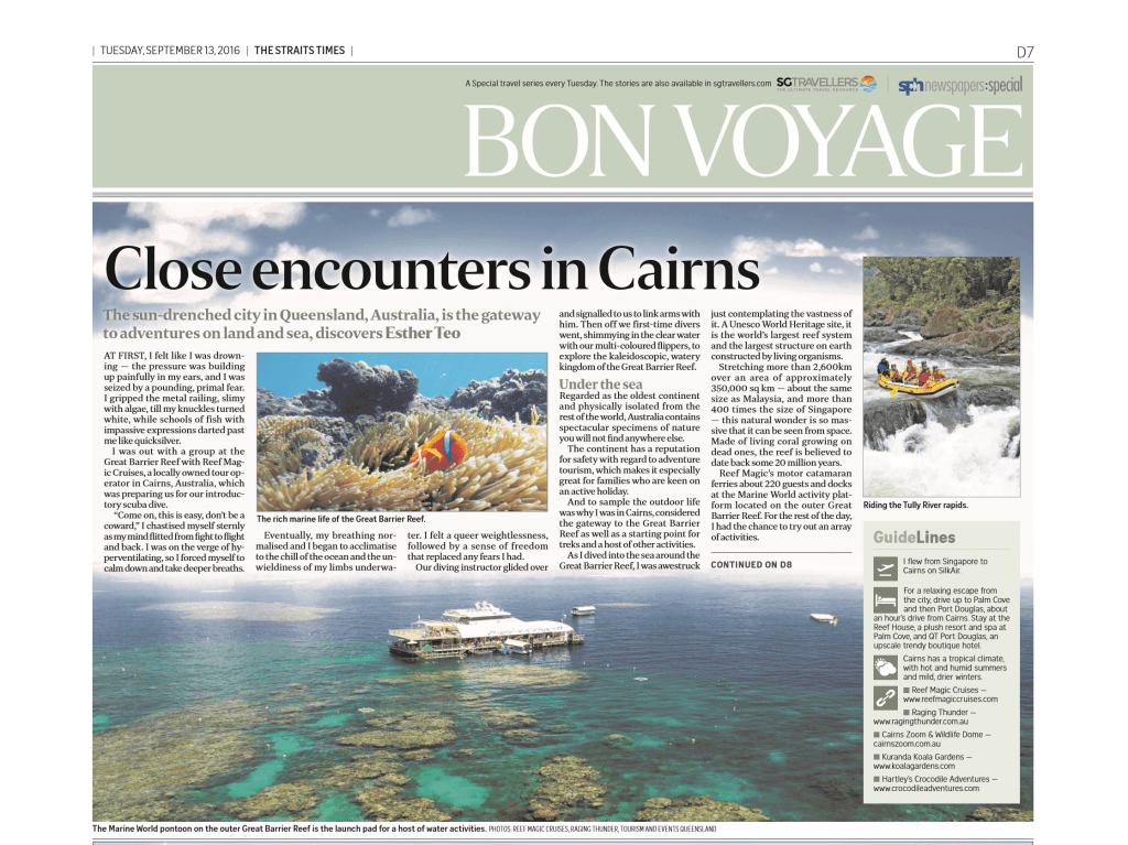 Close encounters in Cairns, Bon Voyage, The Straits Times, Sept 13, 2016 Cl Click here to read it online. Related Categories: Editorial · Travel
