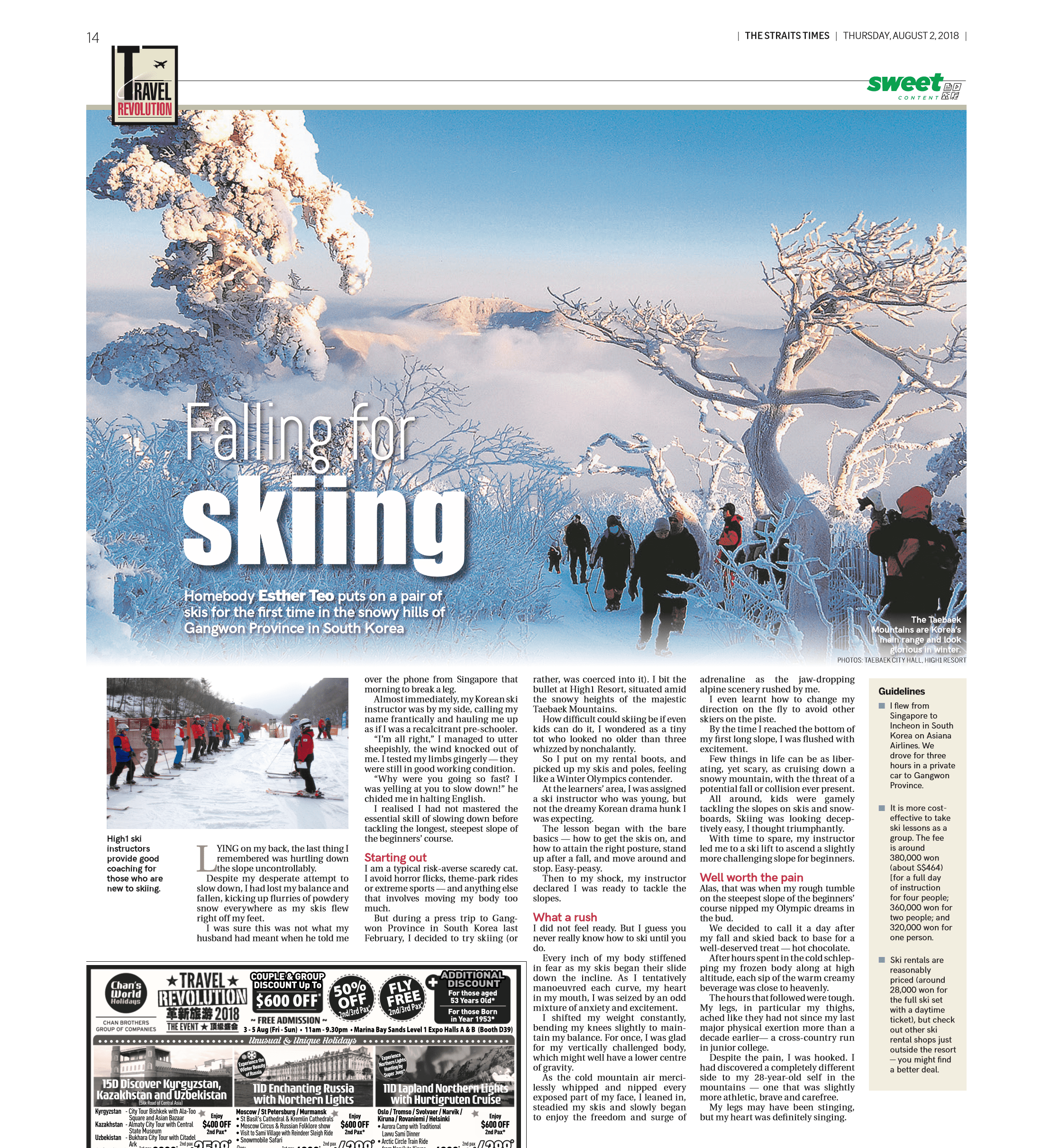 Falling for skiing in Gangwon, Travel Revolution 2018, The Straits Times, Aug 2, 2018 Click here to read it online. Related Categories: Editorial · Travel