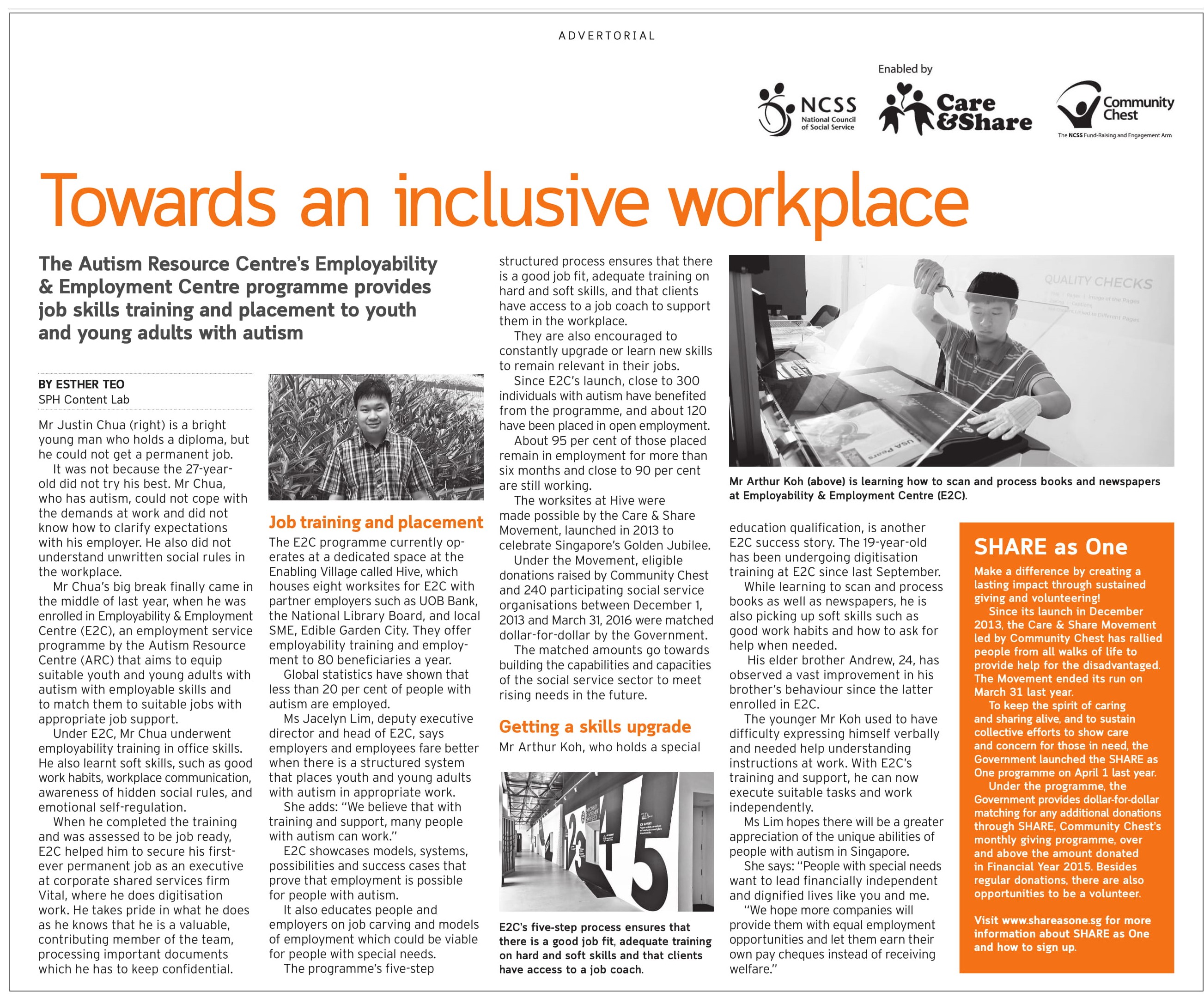 Towards an inclusive workplace, National Council of Social Services advertorial (feat. Employability & Employment Centre), The Straits Times, Feb 23, 2017