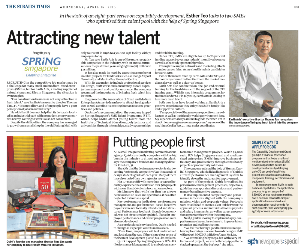 Attracting new talent, Spring Singapore Capability Development series (feat. Earth Arts and Quirk), The Straits Times, April 15, 2015 Related Categories: Business and Finance · Sponsored