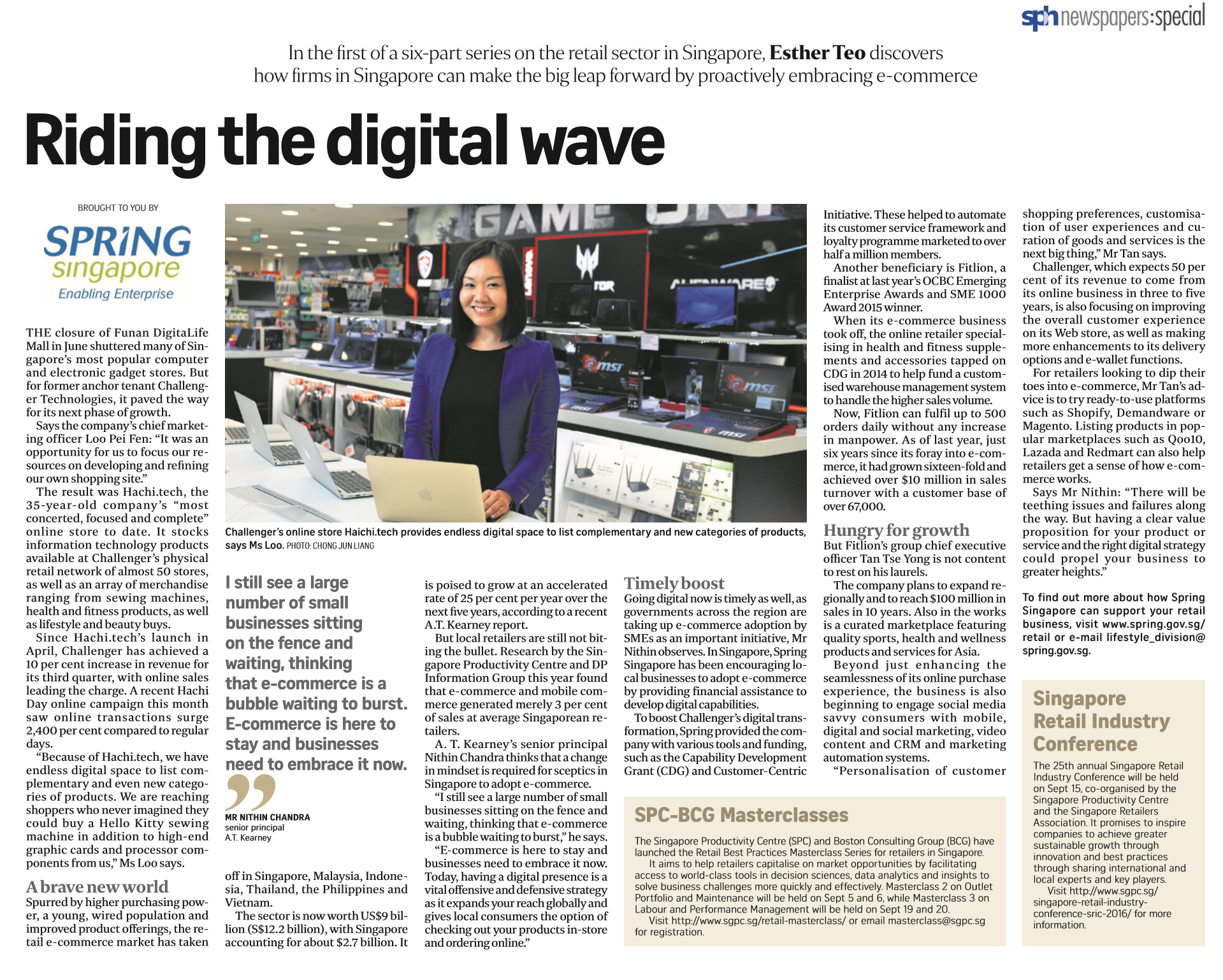 Riding the digital wave, Spring Singapore retail series 1/6 (feat. Challenger Technologies), The Straits Times, Aug 31, 2016 Related Categories: Business and Finance · Editorial · Technology